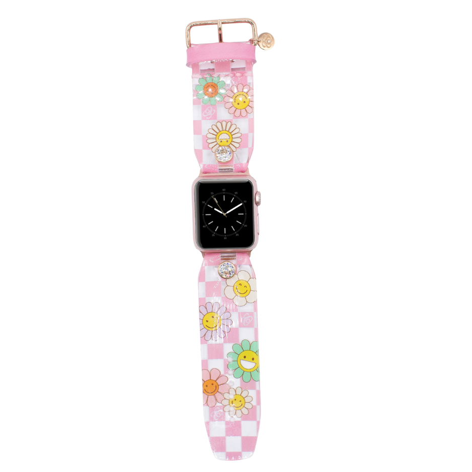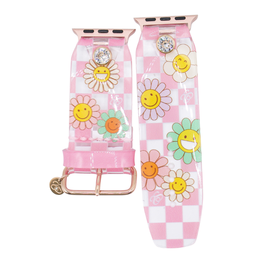 Say hello to sunshine with the Limited Edition “Happy Daze” Waterproof Sivella Watchband- a pastel-perfect design made to brighten every day. Featuring soft baby pink mini checks and the cutest smiling flower motifs, this hand-drawn Wearable Art piece radiates feel-good vibes and carefree charm!
